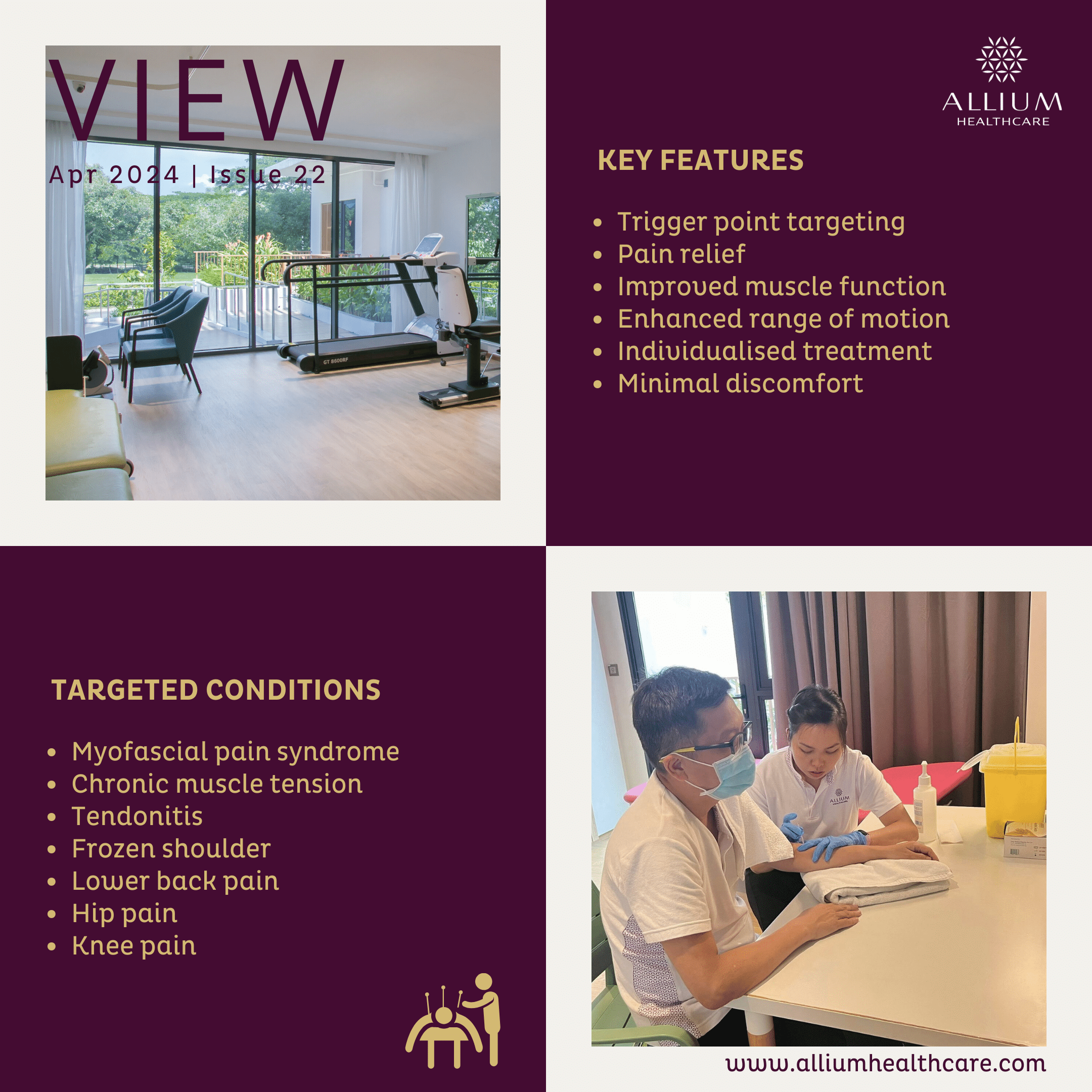 At Allium Healthcare, rehabilitation dimensions coordinate for optimal outcomes. Specifically trained in dry needling, our physiotherapist provides targeted interventions to improve muscle function, relieve pain, enhance mobility and promote recovery, improving quality of life.